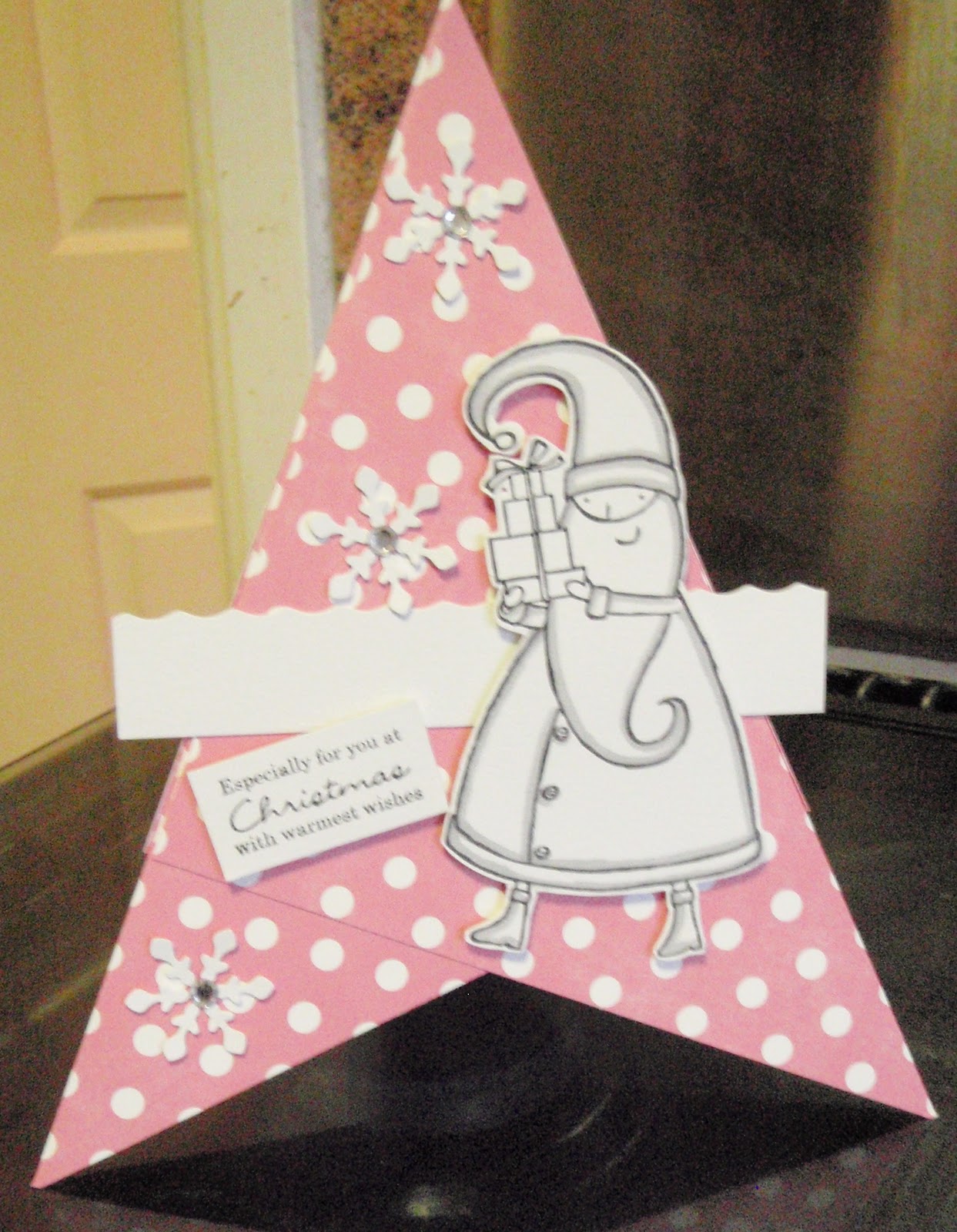 This final card is a little more unusual in that we used 3 squares of paper to make a stand up pyramid shape which was then embellished. Again, we used Papermania stamps and sentiments and added some snowflakes made from punches.
